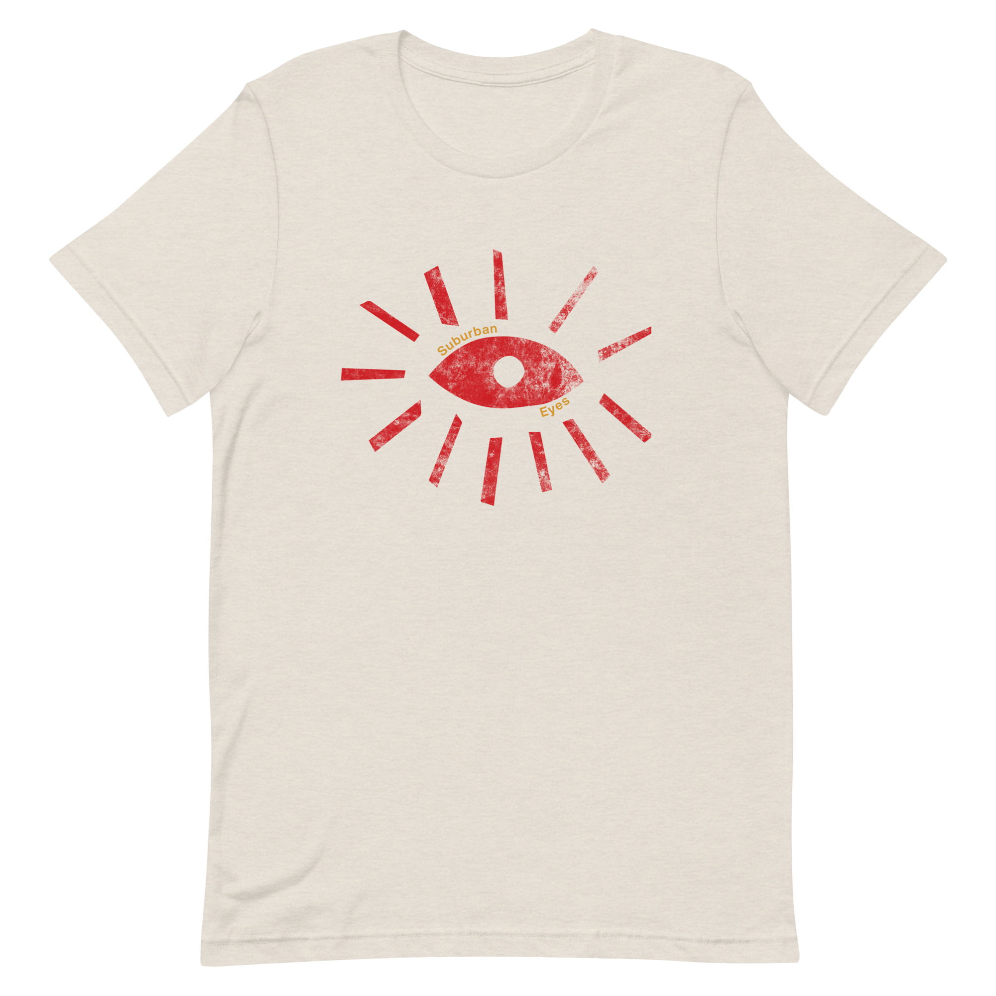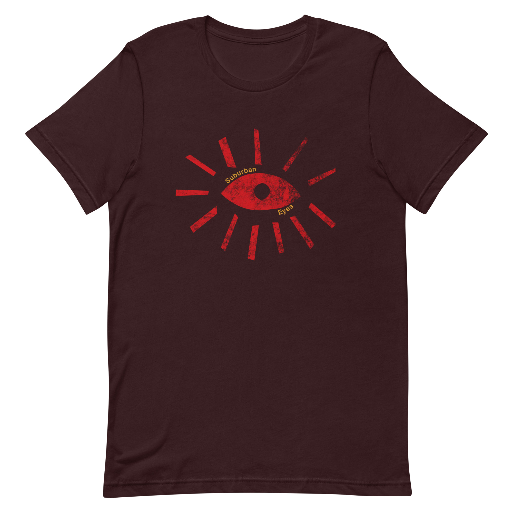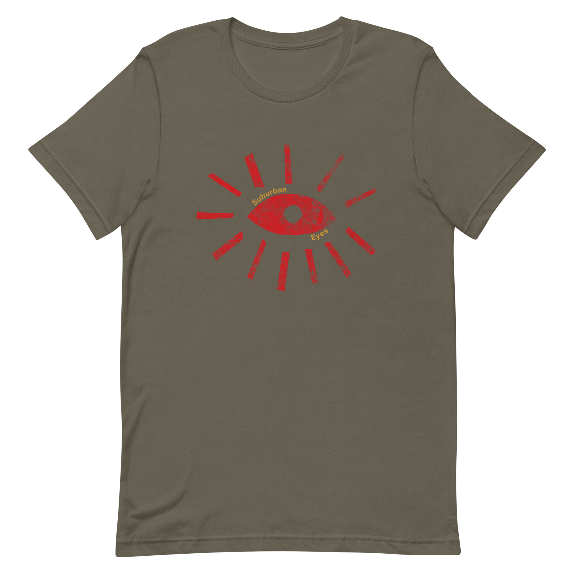 Red eye and yellow band name. Printed on your choice of shirt color.
