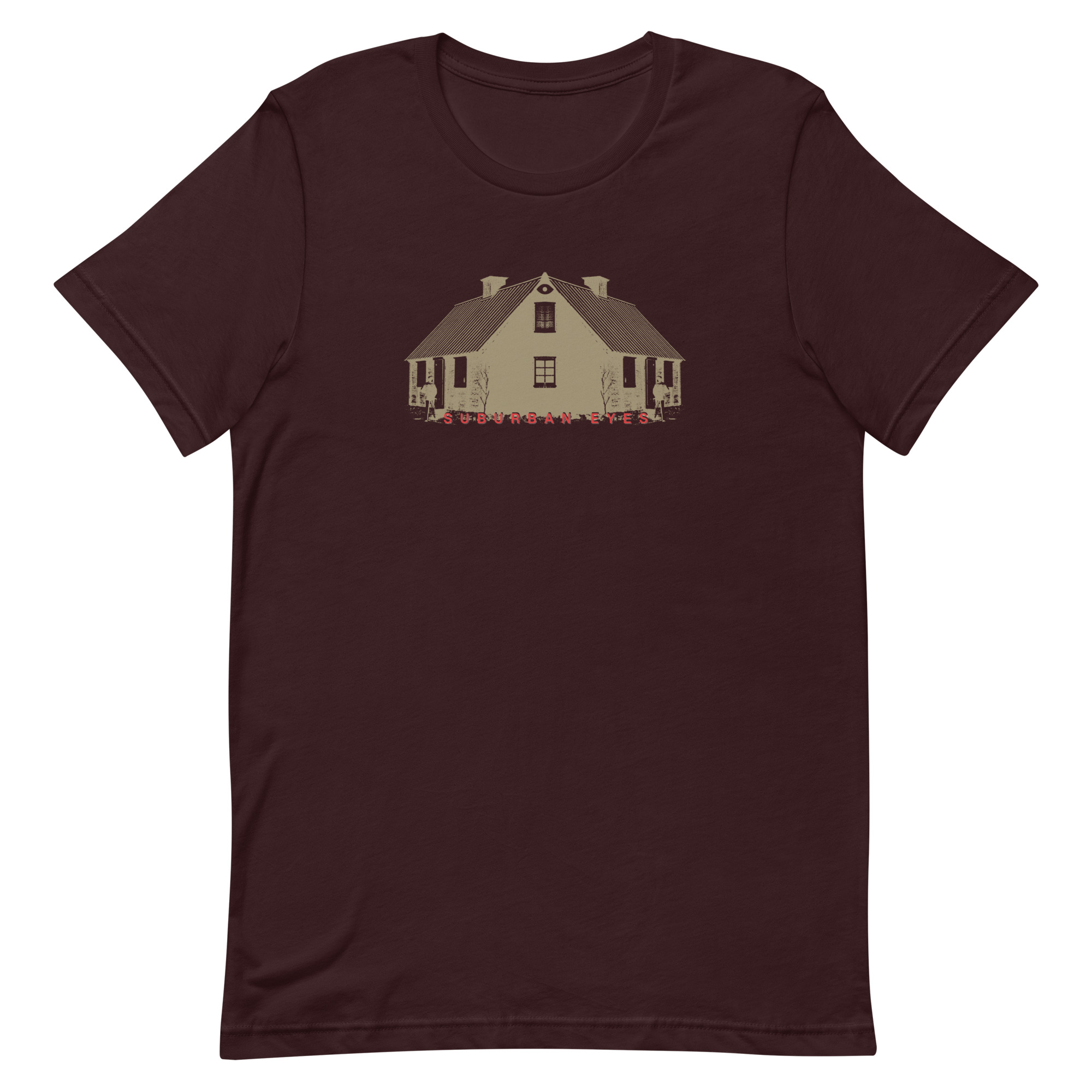 Mirror image house design printed in beige with band name in red. Printed on your choice of shirt color.