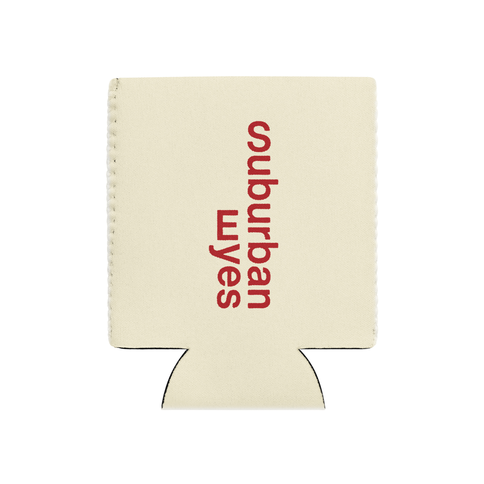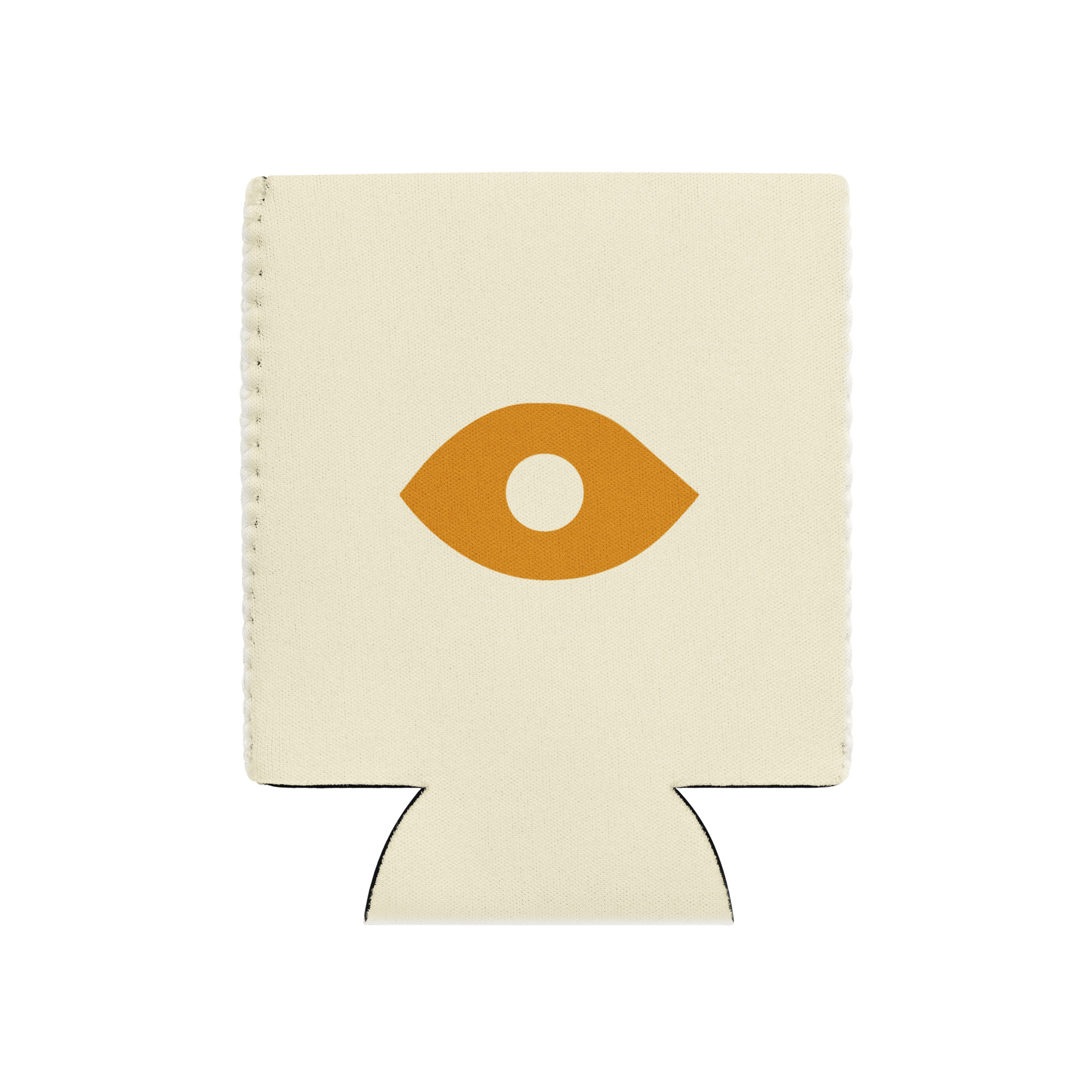 Yellow eye on front. Red band name on back. Printed on a cream Koozie.