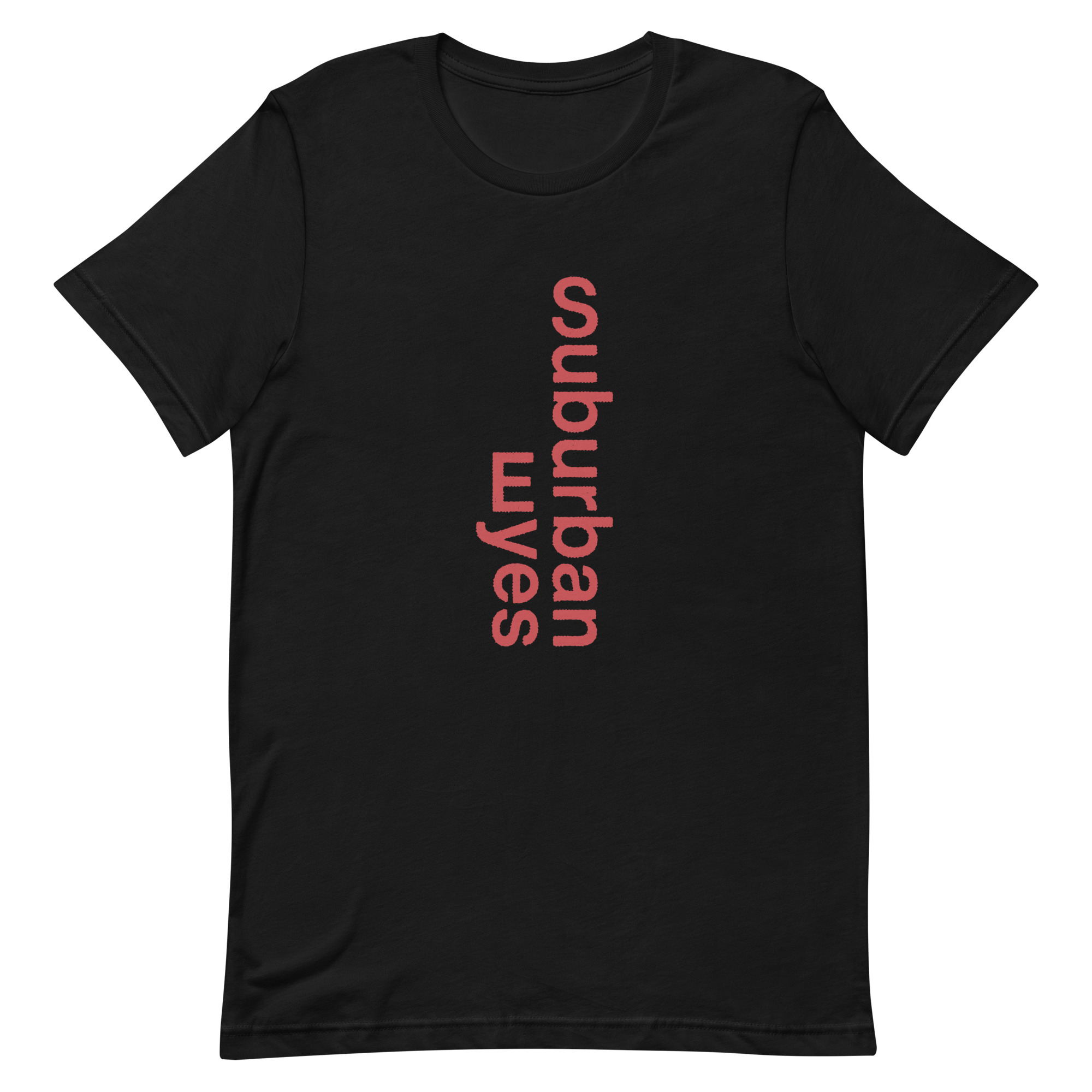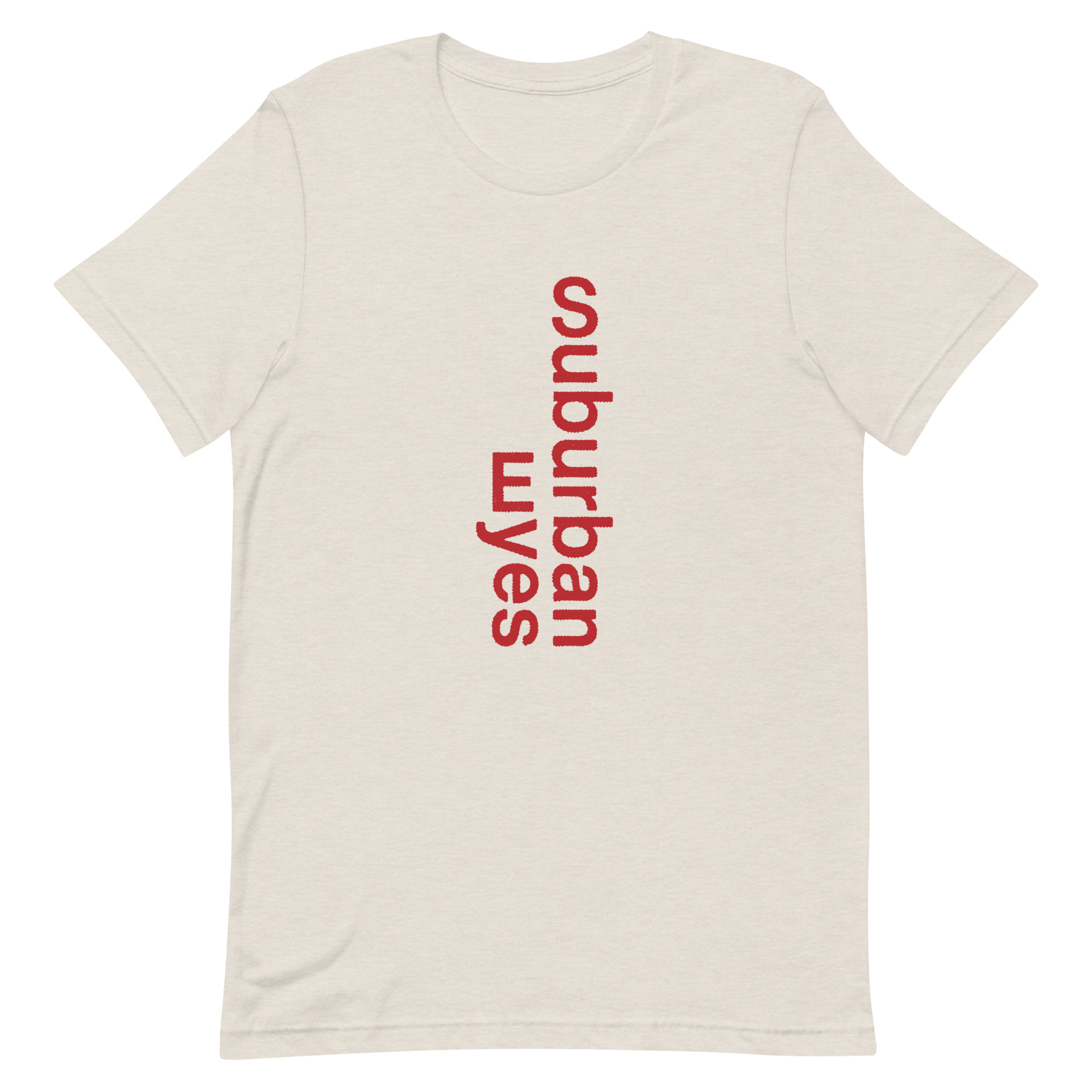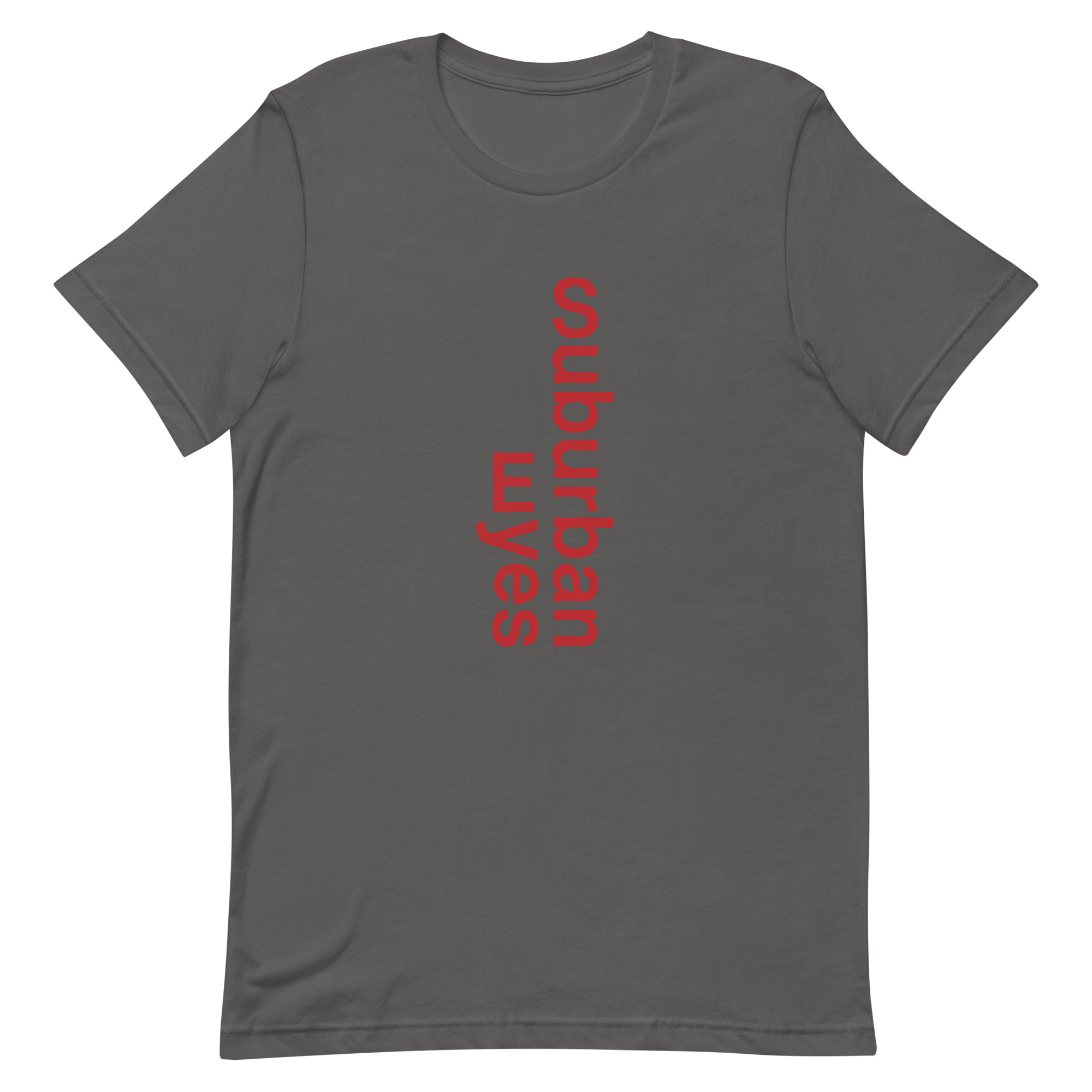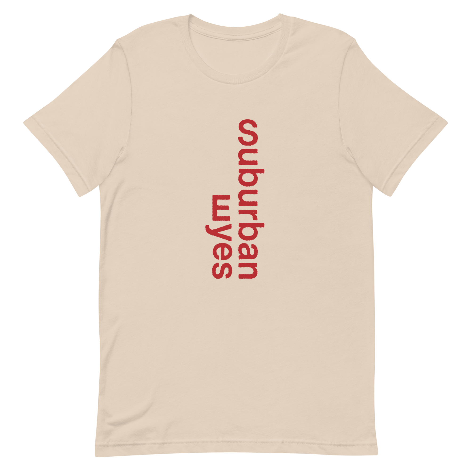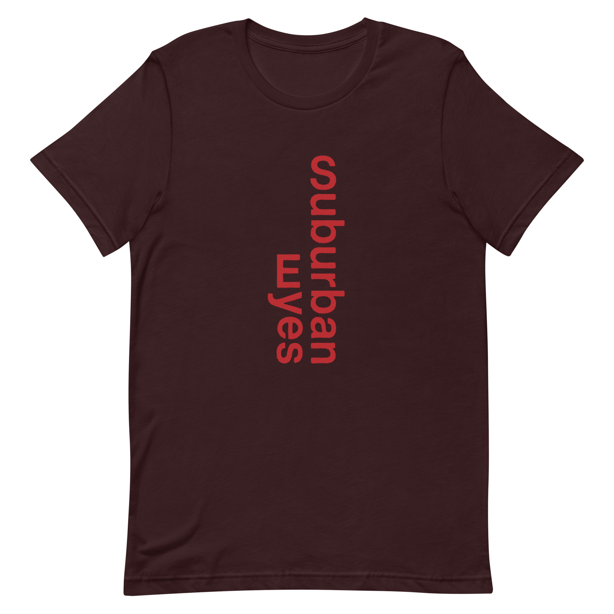 Vertical Suburban Eyes logo in red. Printed on your choice of shirt color.