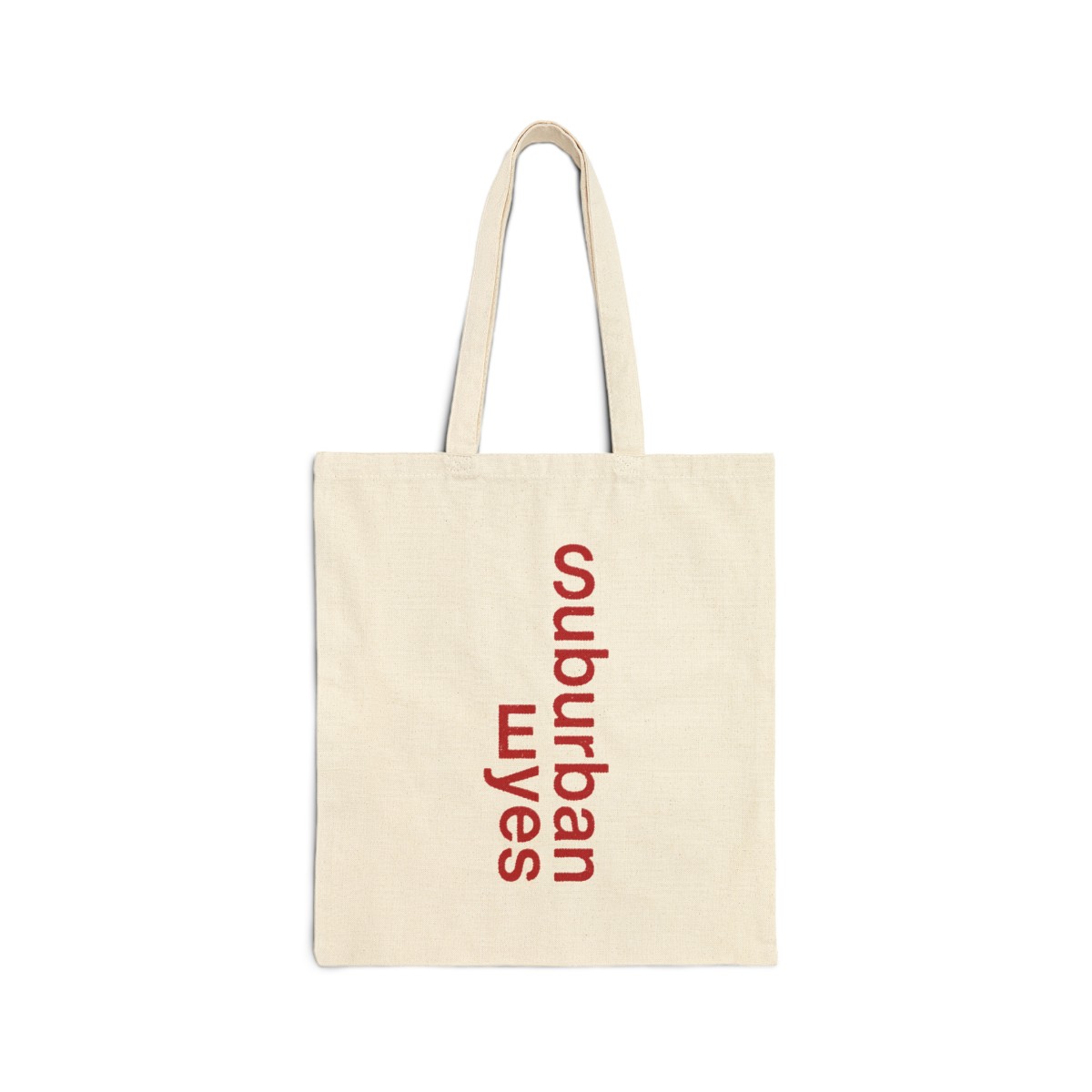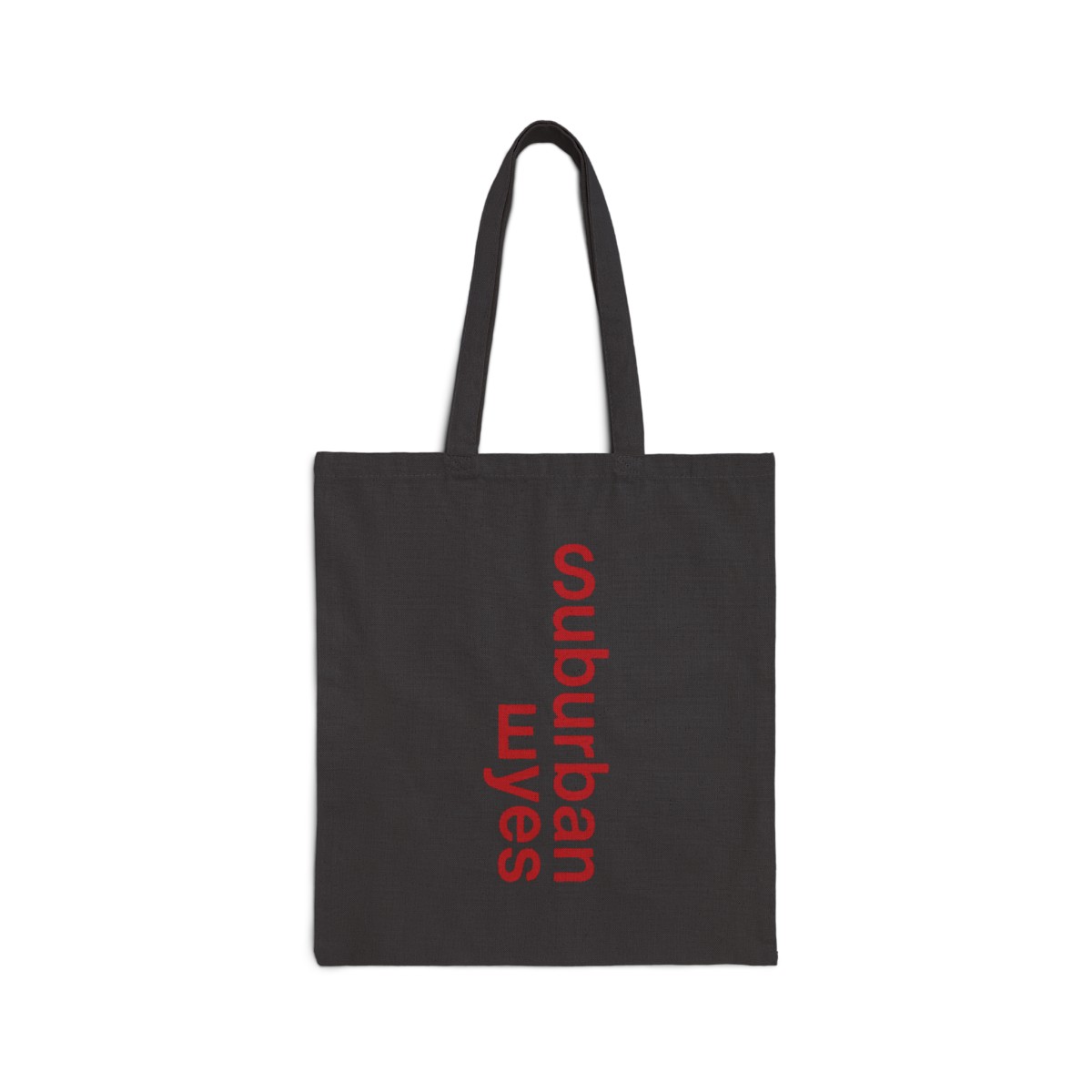 Vertical Suburban Eyes logo in red. Printed on a black or natural tote.